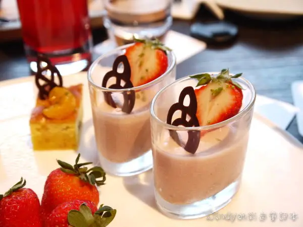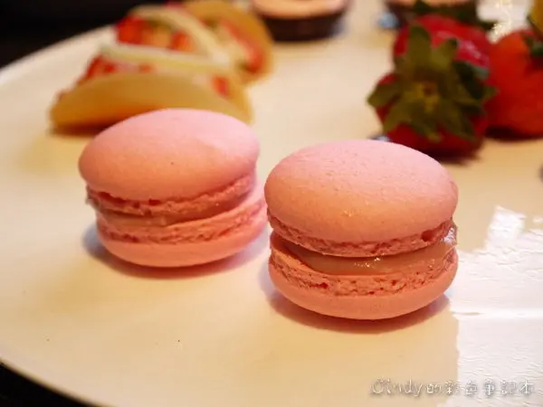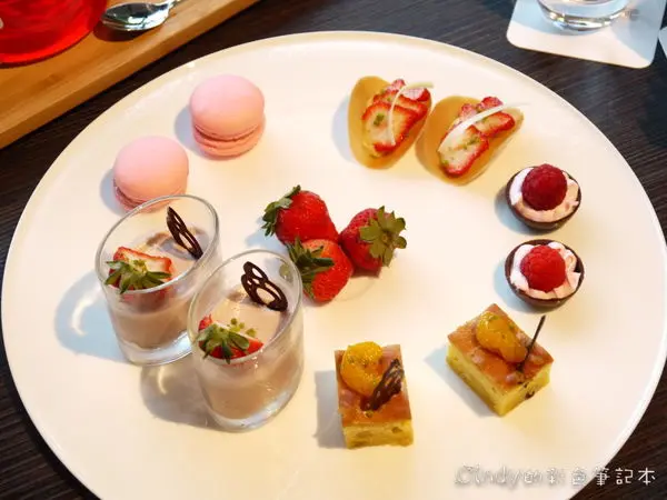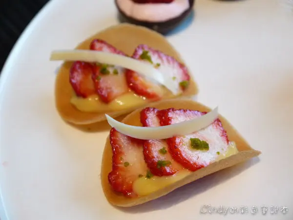 甜點:草莓馬卡龍、草莓慕斯奶酥、草莓檸檬慕斯瓦片及二款當日精選小點(共五款甜點)