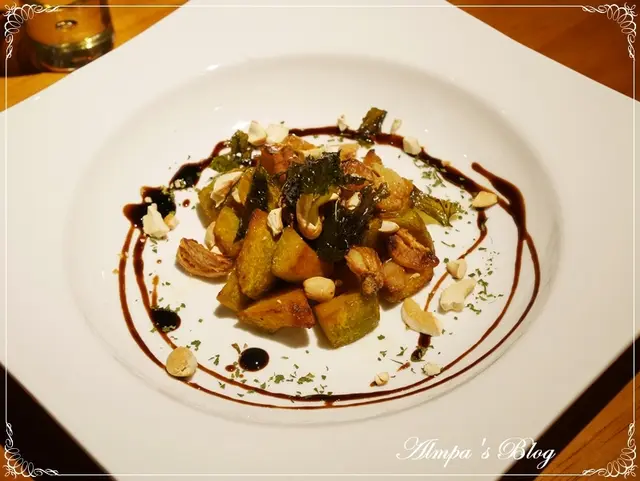選用花蓮南瓜,微焦帶脆的外皮裡包著香甜的鬆軟~搭配堅果和白酒糖醋,香、酥、脆、鬆、甜的爽口開胃!