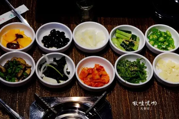 店員先為我們上了十款小菜,有泡菜、涼拌海帶、胡麻龍鬚菜、涼拌香菇等,其中以梅漬苦瓜讓我覺得最特別,