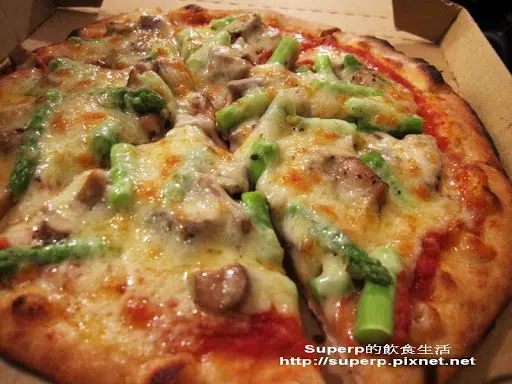 上面的鮮菇蘆筍烤的恰到好處,還保有蔬菜的鮮甜。我最喜歡的是蘆筍,讓披薩的口感增添了豐富性。)