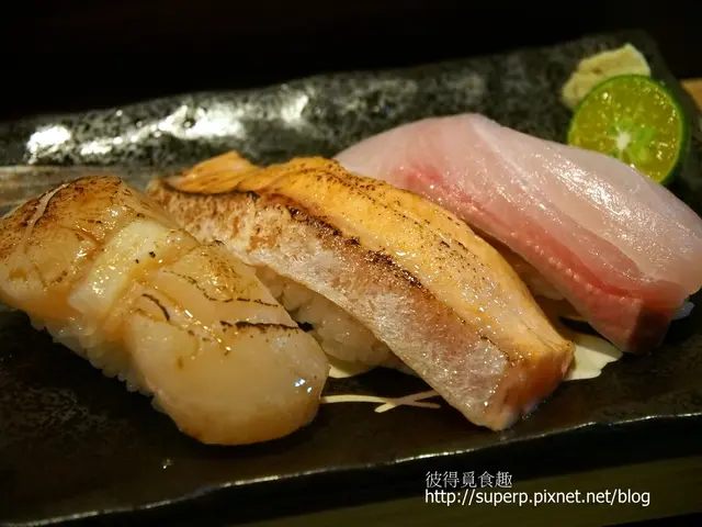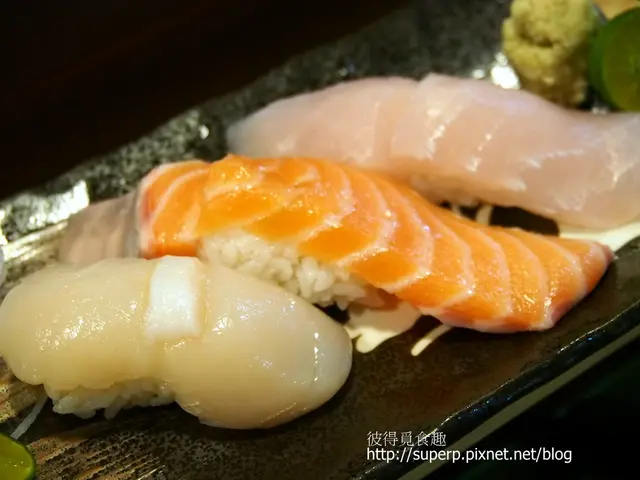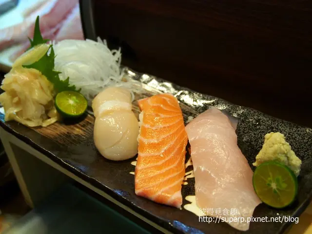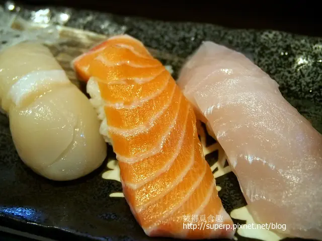 劍旗魚跟鮭魚和干貝(魚料的份量大方,完全的蓋住醋飯。好吃,大推!)