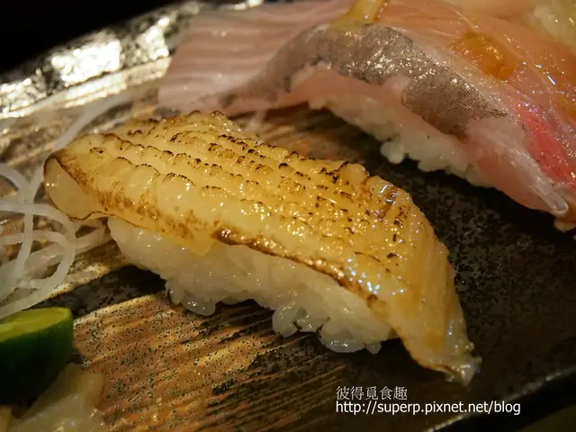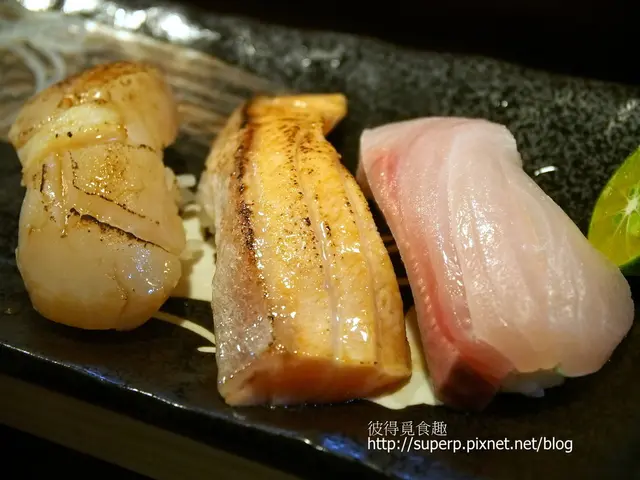 (紅紺度肥美。鮭魚肚跟干貝炙燒過後,甜度更上一層樓,好吃,大推!)