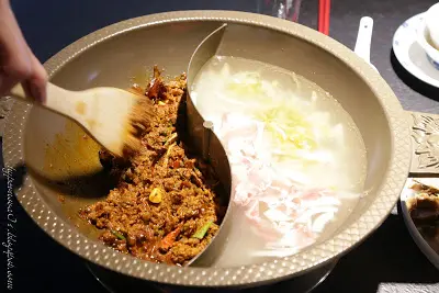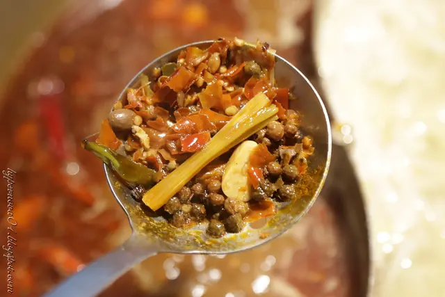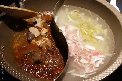 店內自己炒火鍋底料,上桌時呈現糕狀麻辣火鍋底料再倒入雞架子與大骨熬成高湯煮到沸騰就可以下鍋享用喔!