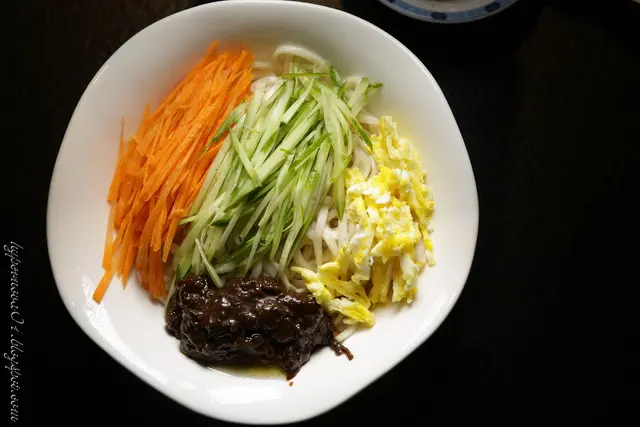 濃郁的炸醬與小黃瓜、紅蘿蔔、蛋絲構成完整的麵