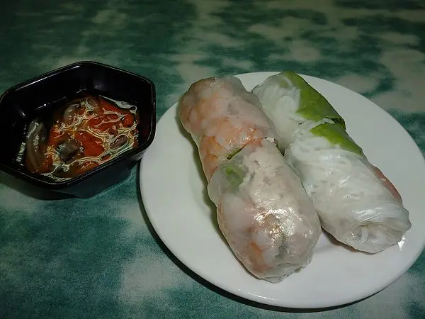 越南鮮蝦捲外型像白色透明的春捲,外皮是薄薄的米皮,裡面餡料是生菜,雞肉,蝦仁,九層塔和米粉,吃這款鮮蝦捲,要先沾一點酸甜的醋汁,酸甜的醋汁帶出內餡鮮美爽口的滋味.蝦仁口感新鮮,生菜和九層塔不但風味特殊,也增加口感上的爽脆.