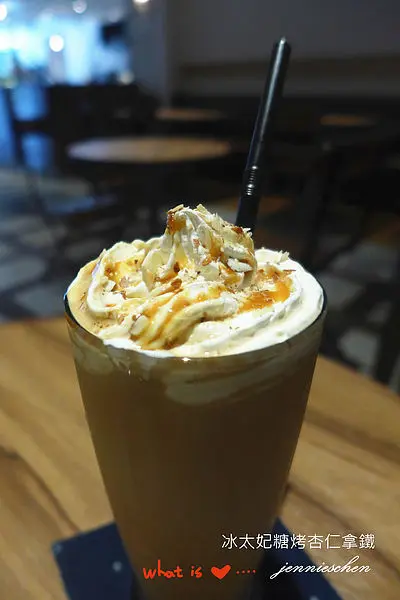 冰太妃糖烤杏仁拿鐵-入口冰涼滑順,帶著杏仁顆粒的脆甜,拿鐵味道柔密,口味細緻。飲品更勝貳房苑!