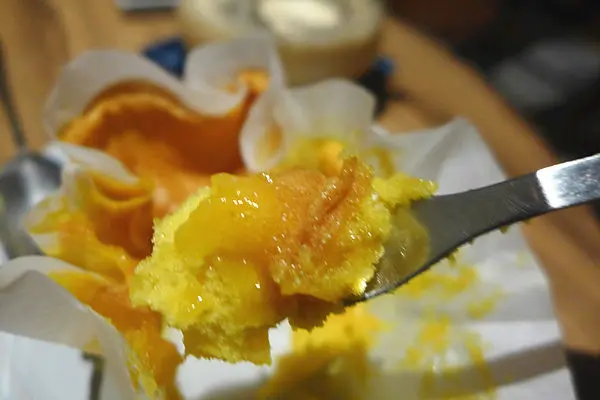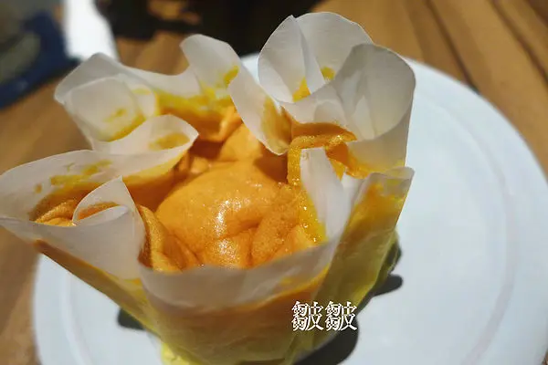 甜點-皺皺 果然有皺皺的感覺。這是半熟蜂蜜蛋糕,有的人可能會不習慣這樣的口感,切開蛋糕裡面是濕稠的。