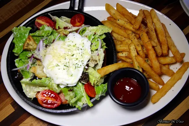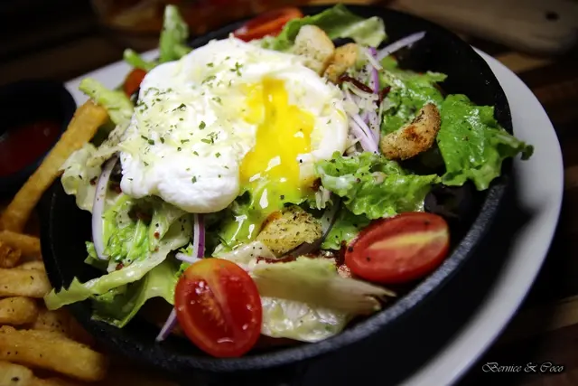 最上頭擺了一顆水波蛋,陪襯一旁的香酥的薯條