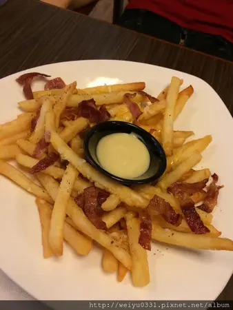 先大推一下這道前菜,雖然是我們自己超餓才硬要單點的,這家店的培根碎末好像不用錢一樣,到處撒,我只能說大器的店果然是生意好的原因,薯條吃起來的酥脆更是差點讓牙齦破皮的那種誇張。