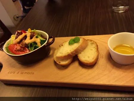 套餐三選二,Ethan選擇了麵包和沙拉,麵包的部分很脆,只可能我不是超愛橄欖油,所以吃起來有點可惜,另外沙拉青菜真的超多,當然少不了這家獨家招牌的培根碎末,加分加分。