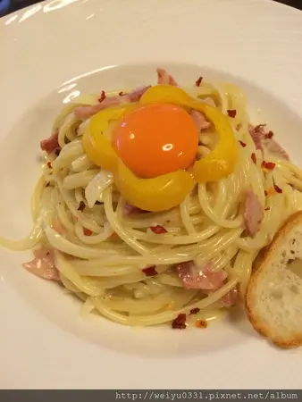 Ethan最愛奶油培根義大利麵,而且最喜歡上面整個半生不熟的蛋黃做搭配,用力把蛋黃跟培根碎末拌在一起,讓整盤麵沉浸在蛋黃的幸福當中,不過旁邊附的麵包我就不太知道是什麼意思了XD