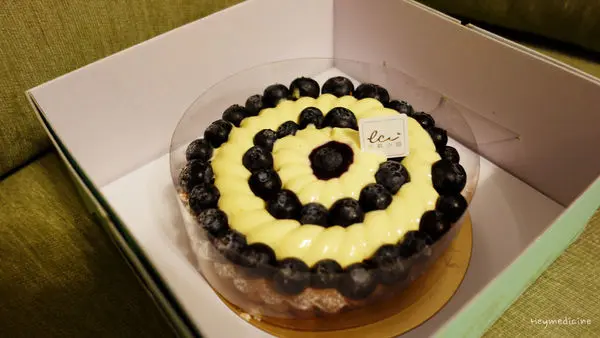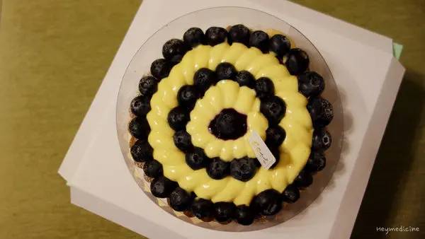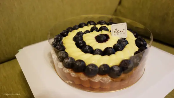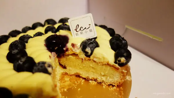 立刻切了一片來試吃,建議用金屬刀比較好切噢!從側面可以看到基底非常厚實,所以我覺得吃起來很容易飽。和現場試吃的一樣,卡士達醬和藍莓完美的交融在一起,再搭配散發淡淡香氣的基底,實在是讓人覺得很幸福的甜點啊!