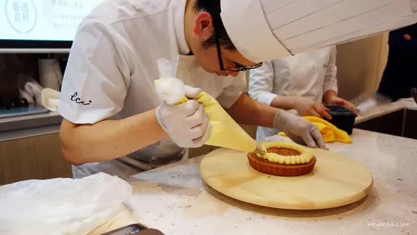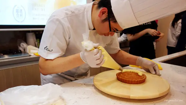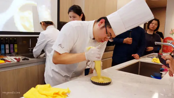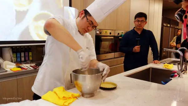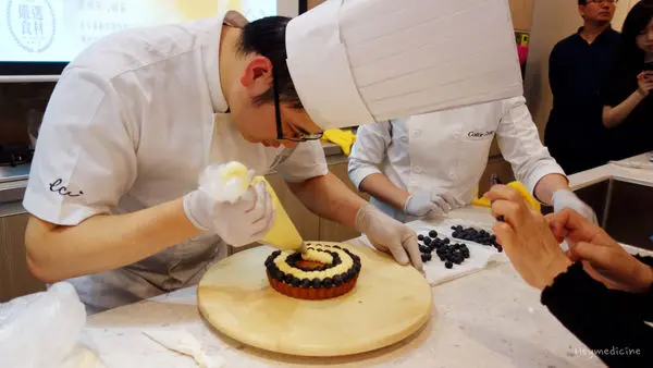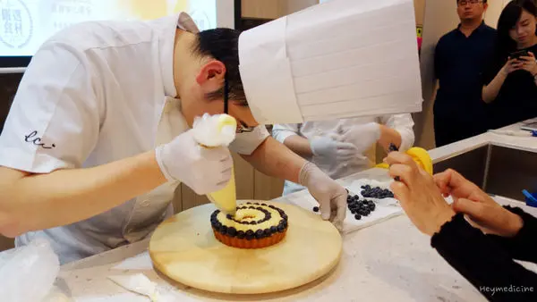 首先登場的是「午夜藍塔」的製作過程。塔皮砸重本使用法國AOC認證頂級的「依思妮Isigny Ste Mère」奶油,而且都是一個一個手工捏製而成的噢!主廚當場先捏好塔皮給大家看,接著再開始製作內餡。