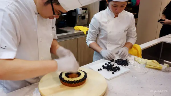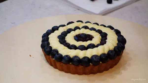 卡士達醬的內外圈分別放上藍莓之後,主廚在內層又擠了一圈卡士達醬。