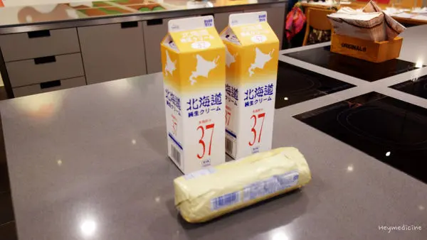 這次沒有要介紹整份鮮乳捲的製作過程,而是把重點放在內餡上。內餡使用北海道進口的「歐牧純生鮮奶油」,沒有添加任何乳化劑,完全取乳脂製作而成。像一般鮮奶這樣小小一瓶,歐牧純生鮮奶油就要價$800,重點是只能保存14天(原本可保存21天,但須扣掉卡在海關的7天)……老闆實在是太拼命了哈哈哈哈。