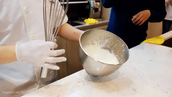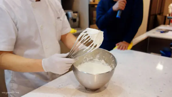 首先會先用機器打發,但因為較難控制,所以最後會人工打發,以達成最完美的狀態。