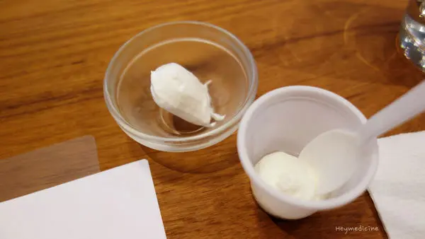 接著又是試吃時間!這次是拿歐牧鮮奶油(右)和一般鮮奶油(左)讓大家比較。歐牧鮮奶油的口感非常細緻,我覺得接近入口即化,吃起來非常清爽,也有點像在喝牛奶。一般鮮奶油則是像市面上的鮮奶油蛋糕一樣,口感比較厚實,而且偏甜,吃完之後會覺得口中還是殘留著一點黏黏的感覺,很容易就覺得膩。