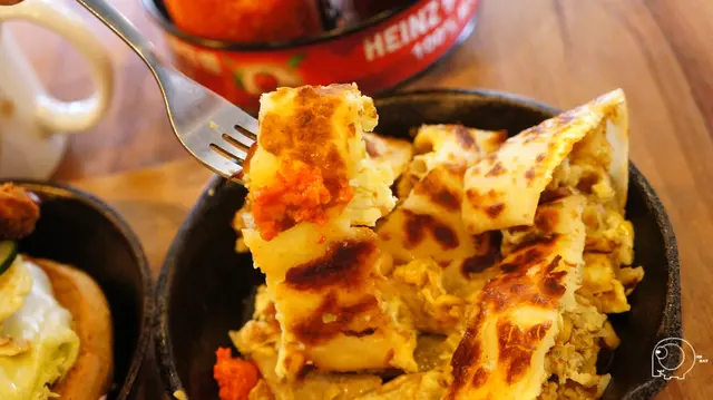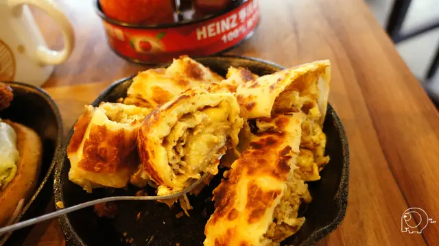 裏面有洋蔥、高麗菜絲、火腿丁、磨菇、玉米、起司跟蛋