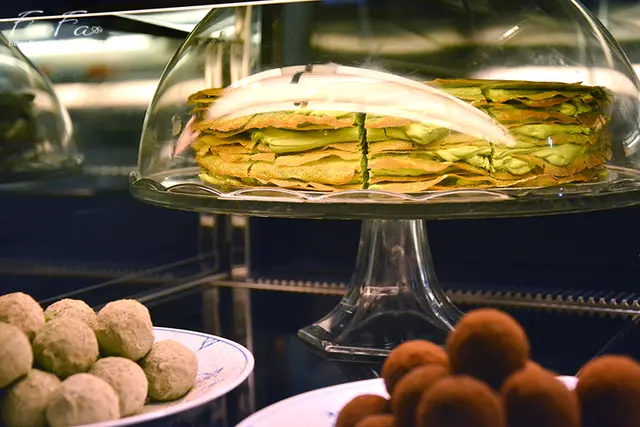 作工反覆層層疊的千層蛋糕,抹茶夾餡分量多,在舌尖軟滑溜搭個不停,滑溜程度讓人訝異,