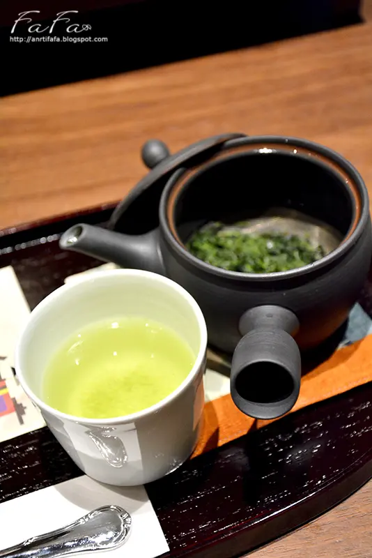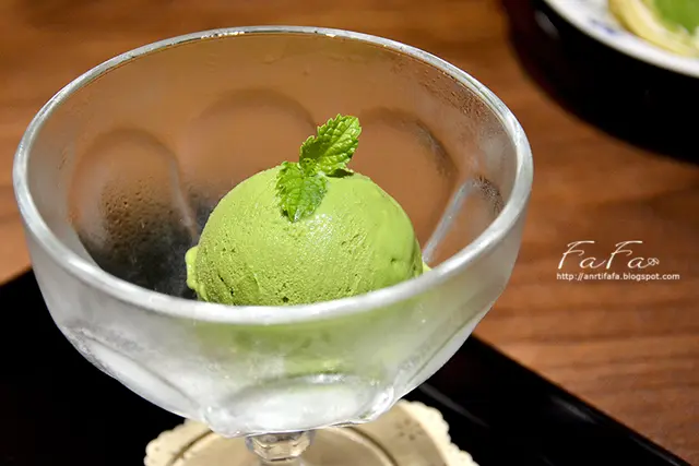 不過我現在才發現MENU上是寫紅豆佐抹茶冰淇淋,這天供應的卻是薄荷。朋友選擇搭配煎茶,另外附上一顆抹茶巧克力,