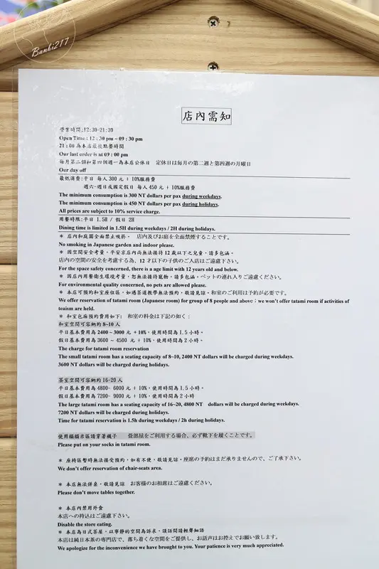 平安京茶事店外公告著店內須知,除了營業時間與公休日外,最重要的莫過於尚未接待12歲以下客人,以及平日低消每人$300元、假日每人$450元(以上需另加收一成服務費)的規定,另外用餐平日限制為1.5小時,假日則為2小時。(但平日似乎若現場客人不多便