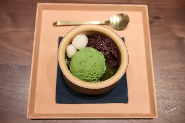 若竹為宇治金時,日本宇治的抹茶及又可名為金時豆的紅豆,此款若竹的抹茶採用宇治丸九小山園的抹茶製成(請見店家FB照片)。抹茶冰淇淋茶香濃郁,茶芳香瀰漫在口腔內,口感Q綿且不甜膩很是不錯!一旁的白玉Q彈,紅豆表現很好因不死甜且綿密。