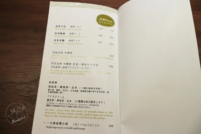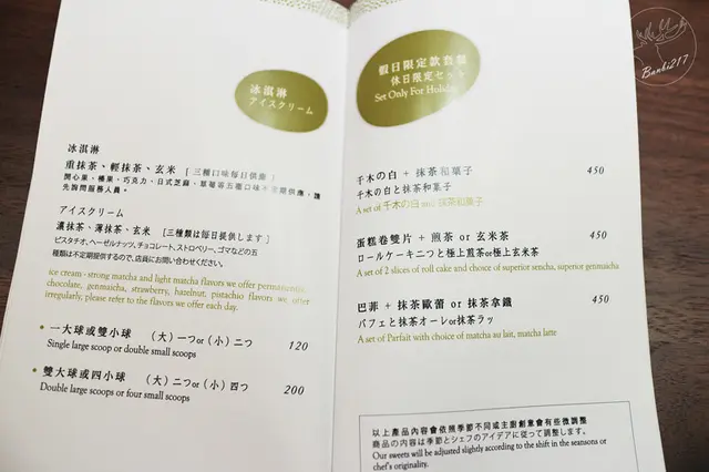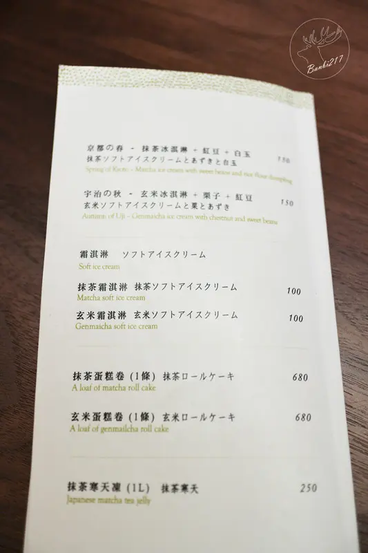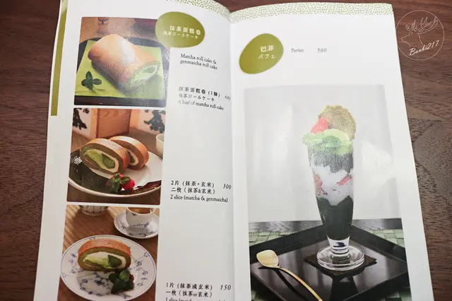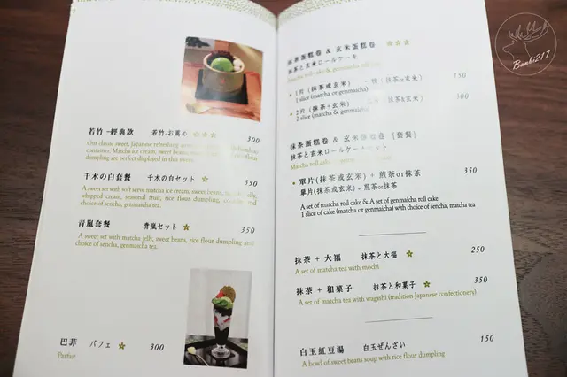 點了一份若竹,在菜單上見到了巴菲、若竹與千木の白套餐這三種相像但又有些不同的抹茶冰淇淋組合(菜單照片請見文末),詢問了店員得知大致為分量、水果以及鮮奶油上的差異,而這三者中無鮮奶油、無水果且份量最多的便為「若竹」。