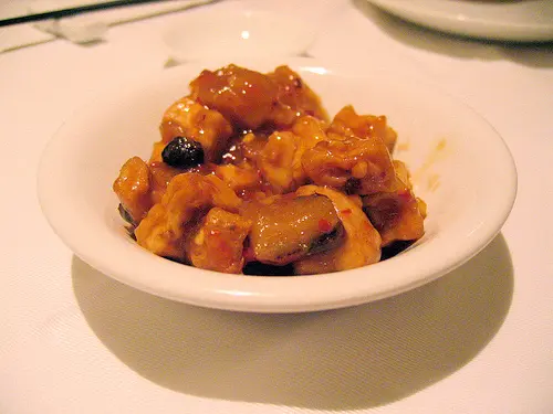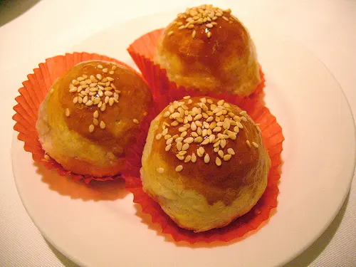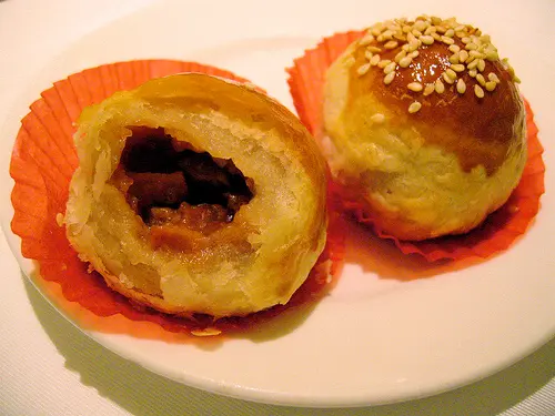 叉燒酥送來的時候有點驚訝,幾乎吃到的都是長條狀,第一次吃到作成如蛋黃酥形狀的叉燒酥,不難吃,但是底部太油了些,不夠酥脆。