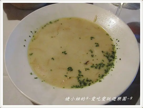 一般來說餐廳濃湯都是盤子大 湯卻少的可憐沒想到這濃湯也盛的太滿了吧XDDDD湯頭不是非常稠的那種比較偏湯湯水水的感覺裡面有不少的蘑菇 細洋蔥絲 是好喝低