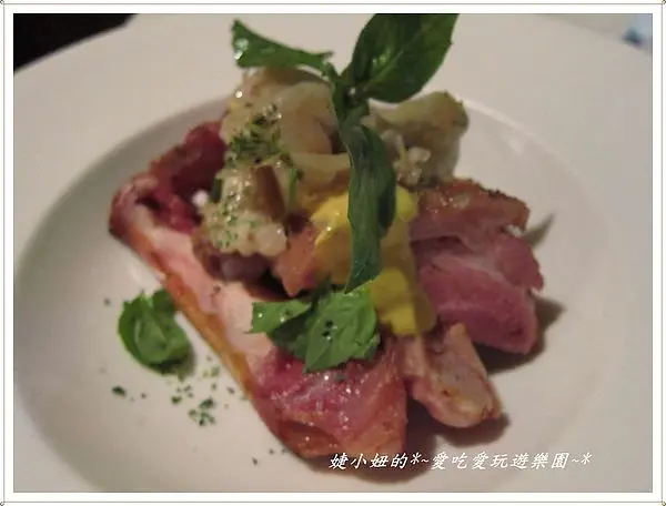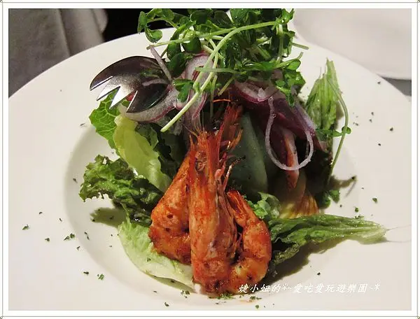 這道冰涼的沙拉好好吃喔~除了有大的去殼蝦之外 還有櫻桃鴨肉耶~單吃鴨肉就很有甜味我還很愛用生菜 包覆著鴨肉在沾著油醋醬這樣吃也好美味