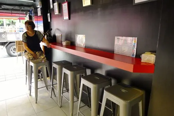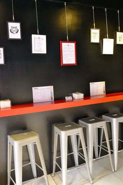 座位區.只有靠牆的小小長桌和6張椅子.以黑牆+紅桌+銀椅.三色組合而成的座位區