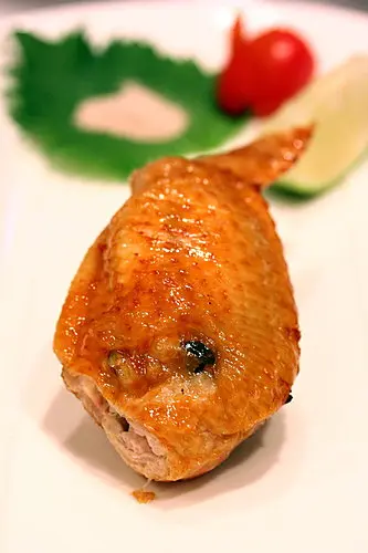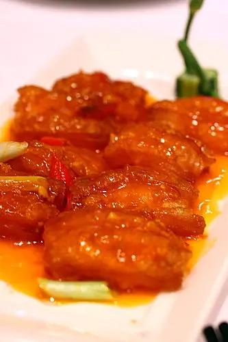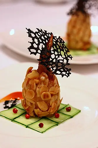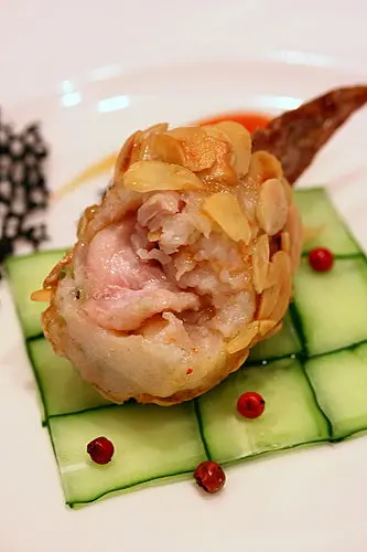 太久之前吃的了,完全忘記菜名,是用蝦漿顆住去骨雞翅中斷,再沾上杏片油炸而成,雞肉和蝦漿的鮮美融合在一起,杏片的脆度讓整體口感更有變化!一上桌那美美的模樣更是讓人捨不得吃啊!