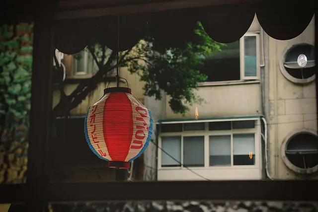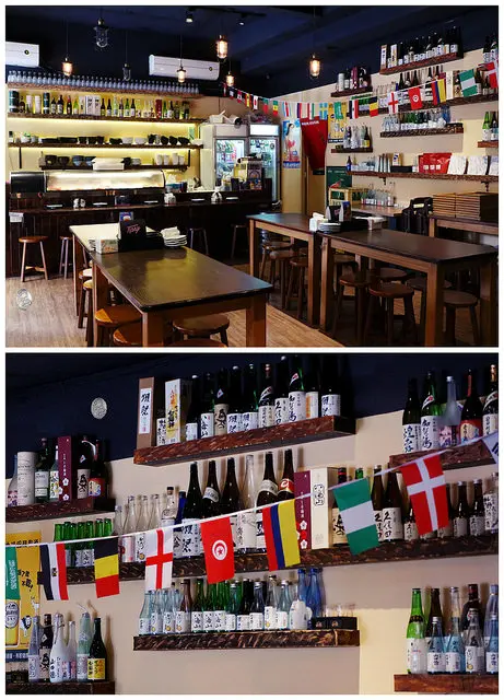 門口的燈籠與立牌十分醒目。座位空間寬敞,簡單的日式食堂風格,牆上擺滿了各式各樣的酒瓶。
