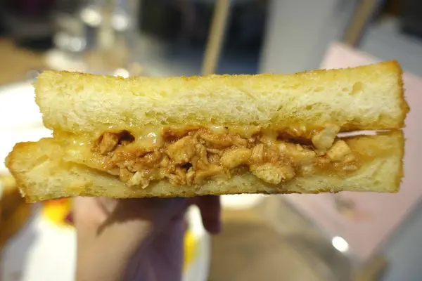 這款脆煎三明治裡夾有切片乳白切達乳酪、抹上煙燻BBQ的嫩雞胸肉~