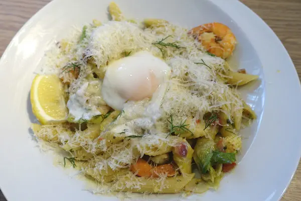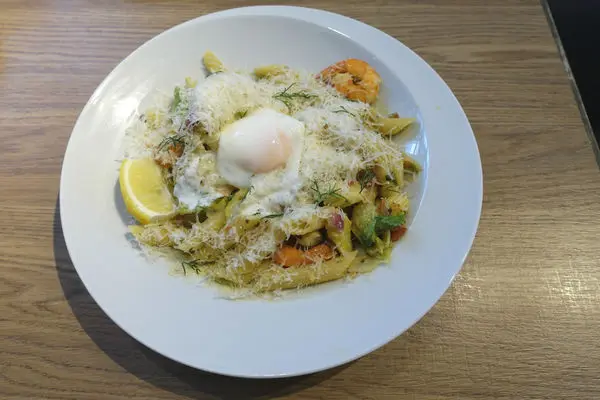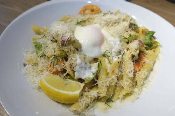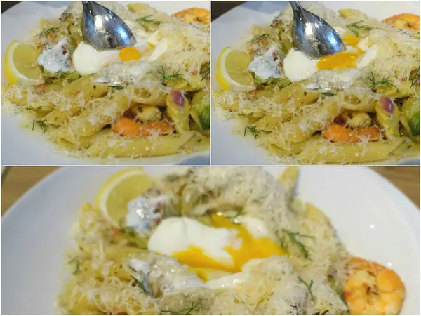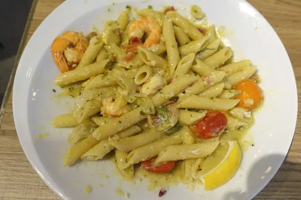 不對稱圓盤裡是鮮蝦酪梨醬筆管麵,因為其他三款義大利麵都有加酒調味,