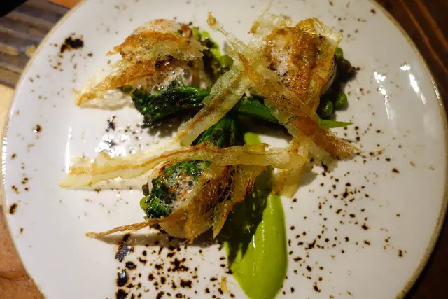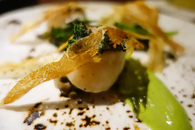 在干貝上風乾培根脆片,吃起來比洋芋片還要脆口,能把培根片得如此的薄,廚師的工力了得阿
