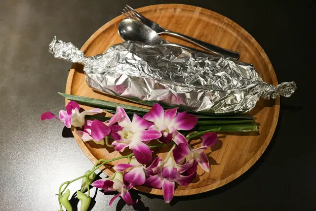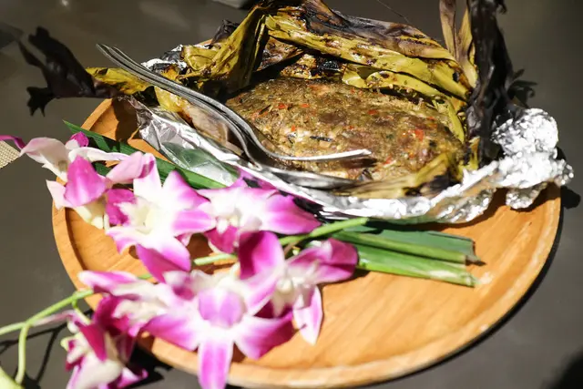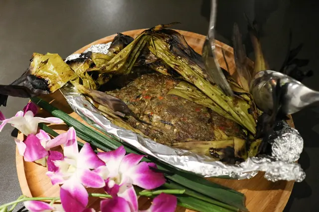 用芭蕉葉緊緊的包裹著魚肉!一打開芭蕉葉陣陣的香氣冒出來