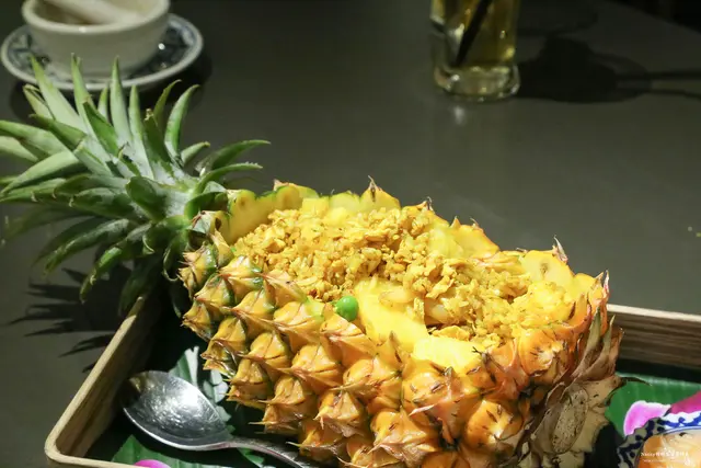 以咖哩為底放了為數不少的新鮮鳳梨塊,青豆,蝦仁,叉燒肉
