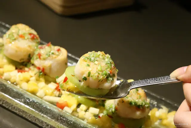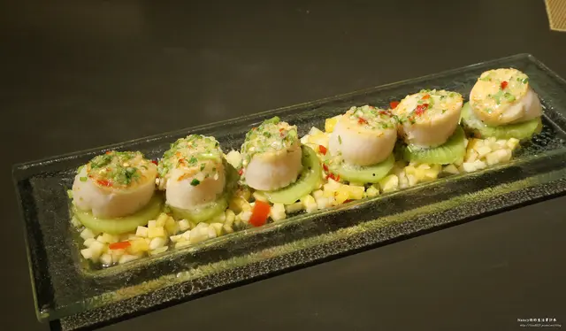 最下層放了水果丁(蘋果/鳳梨)再放上一片綠色奇異果,煎得大約三.四分熟的干貝上頭鋪上酸辣的醬料