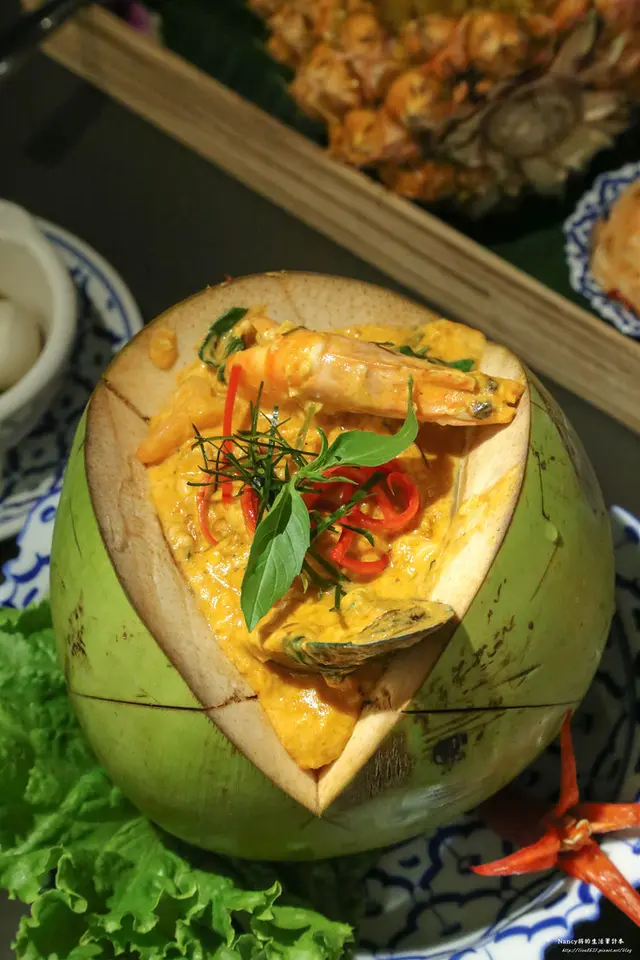 前後已經送上了整隻鳳梨,整顆南瓜,接下來還送上整顆椰子XD(我們又被隔壁桌的客人行注目禮了)
