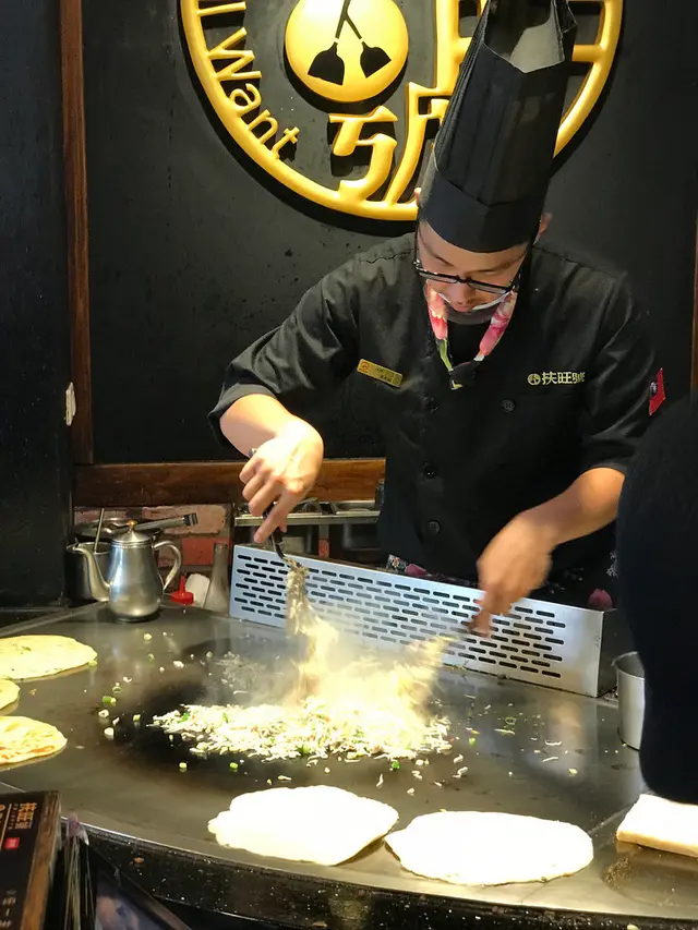 看師傅在鐵鍋上一下蛋餅一下炒配料