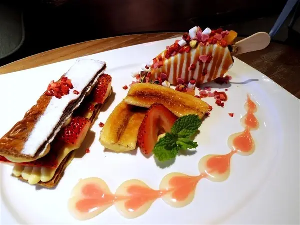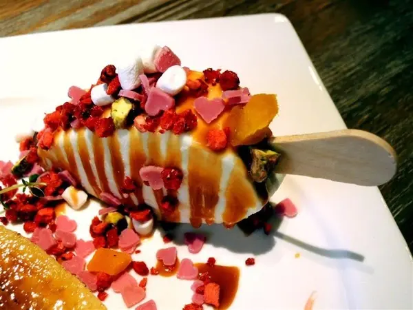 柔軟香蕉灑糖在噴槍烤過 還滿費工的