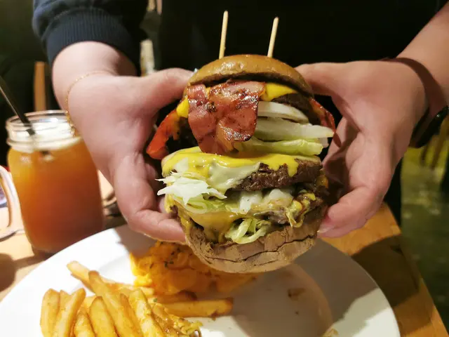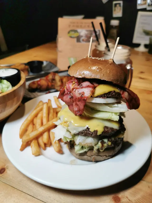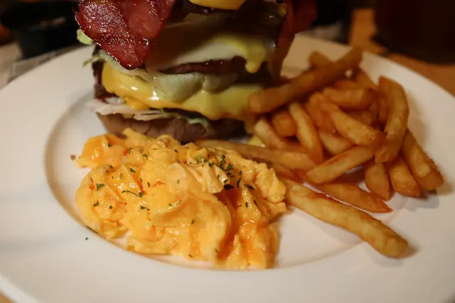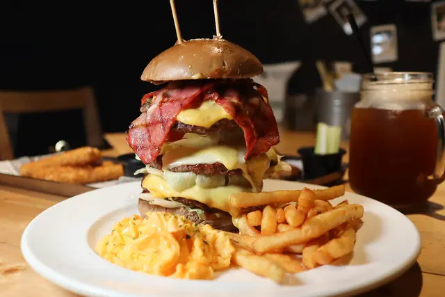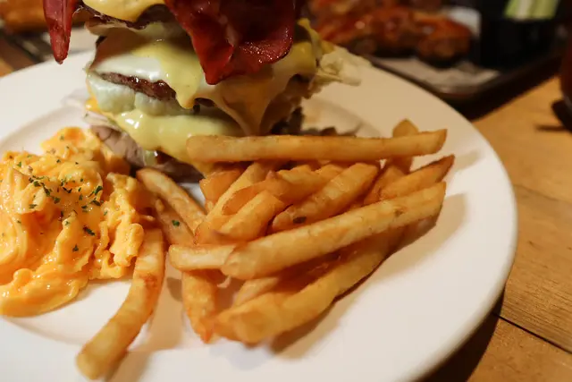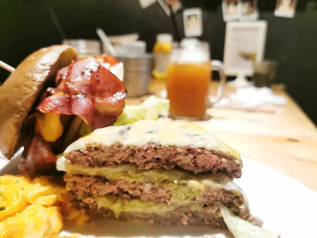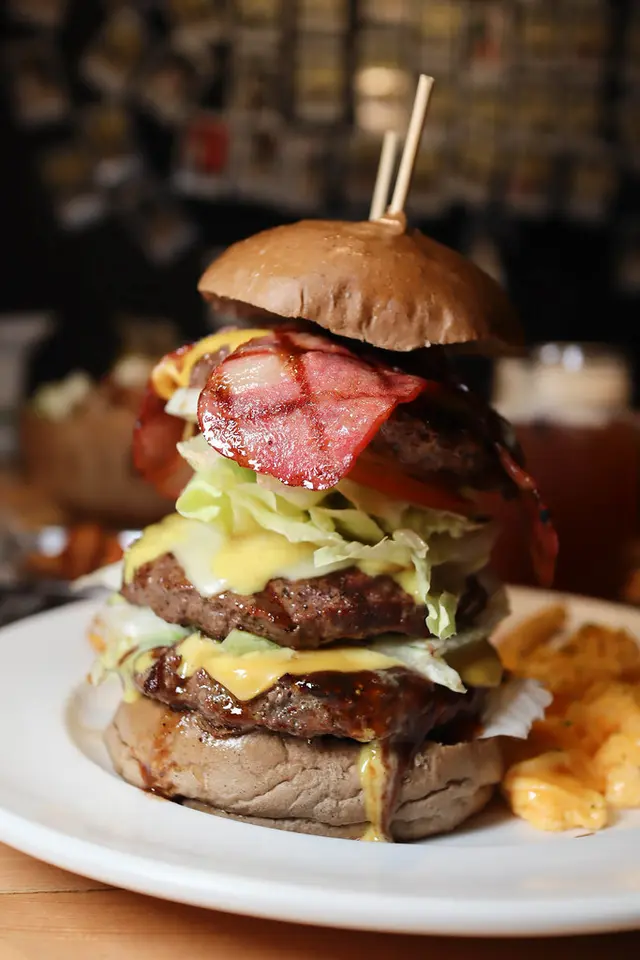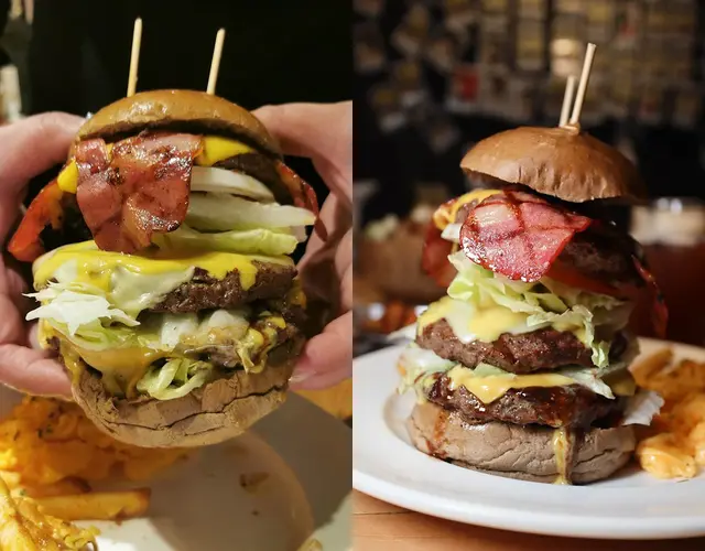 這個漢堡擁有5.5OZ的火烤牛肉排(共有3片)+3片美式起士+2大片的培根肉還有份量十足的生菜
