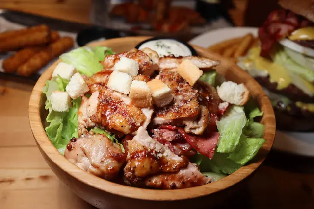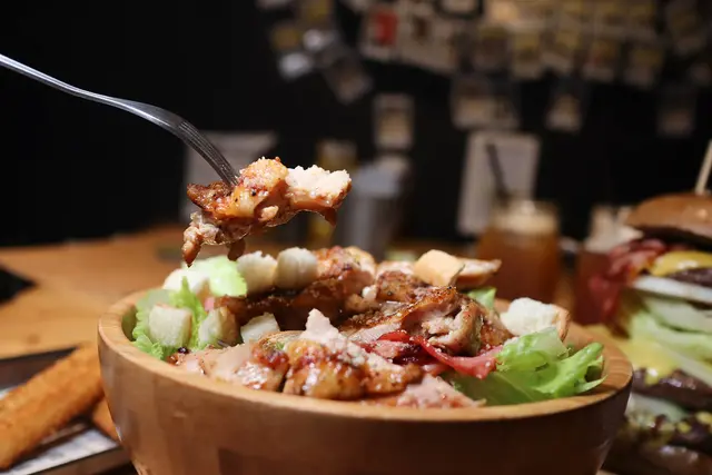 份量十足的木盆沙拉,裡頭放入大量的生菜,煎香培根,麵包丁還有主角火烤雞腿