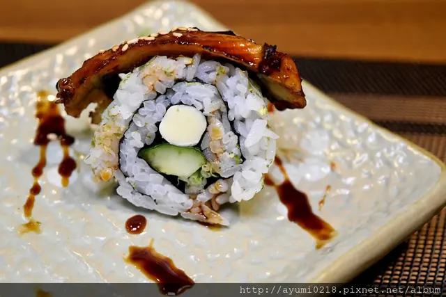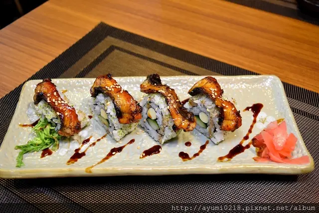 國外相當盛行的加州捲.在三川也可以品嘗的到純正留學好手藝龍捲壽司320(鰻魚X起司) 非常豪邁的切成4大塊每一塊都品嘗的到蜜汁鰻魚與起司拼湊再一起的衝突感