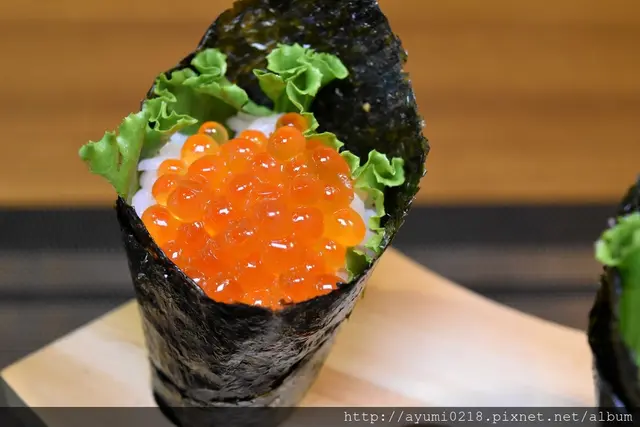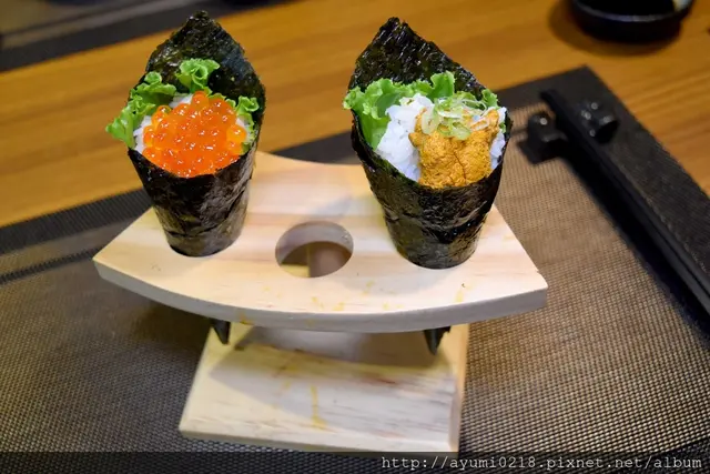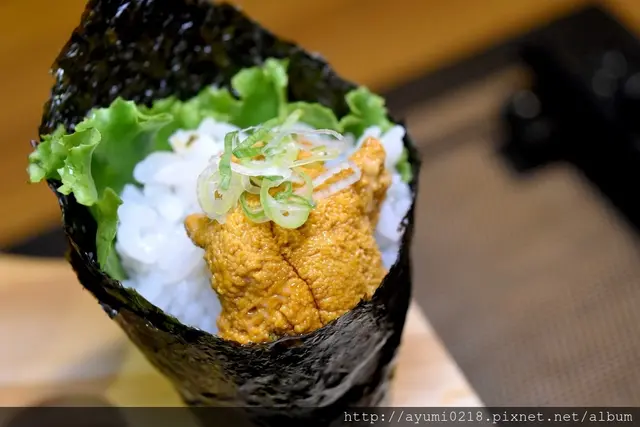 海膽及鮭魚卵部分都很新鮮.底下滿滿的白飯.用生菜包裹著.沒有太多醋飯的溼度跟醋味 我喜歡脆一點的海苔.握壽司吃來口感比較平