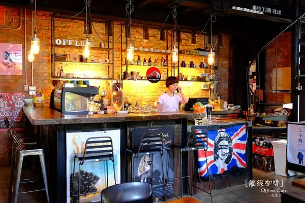 ▼離線咖啡Offline Café充滿濃濃的工業風氛圍,暖黃色的燈光、與暖陽的煦,為店內更添幾許暖意,
