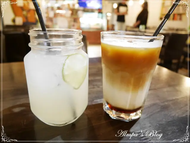 很快就送上我們點的飲料: 鮮榨檸檬汁 、 巧克力餅乾拿鐵