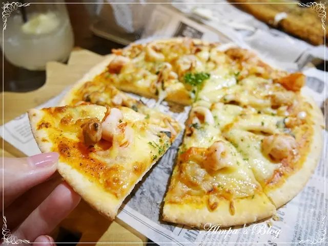 比較特別的是它的餅皮不像我們一班在外面吃到的披薩那樣,帶有Q彈的厚度,或是薄脆的餅皮~