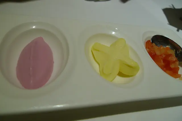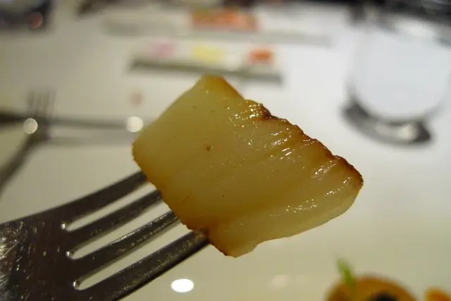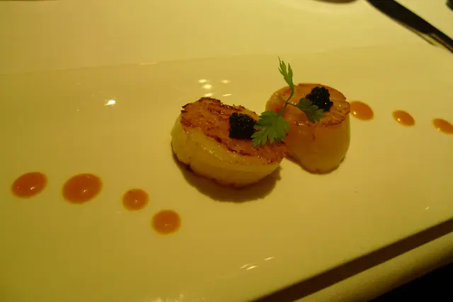 盤中擺設與香煎干貝佐番茄鯷魚醬汁很像